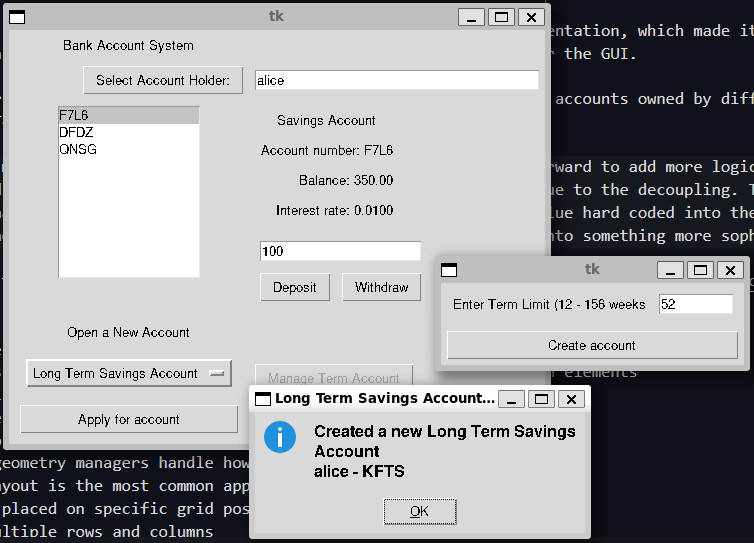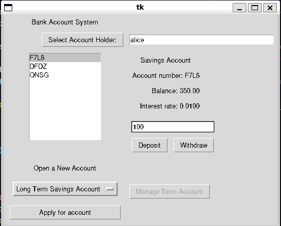 The program that actually runs the code is BankAccountGUI.py. It has basically no changes compared to the shell version which is what we want. Like with the final graphical fashion shop, we can use a shell interface or a graphical interface to the same underlying data model