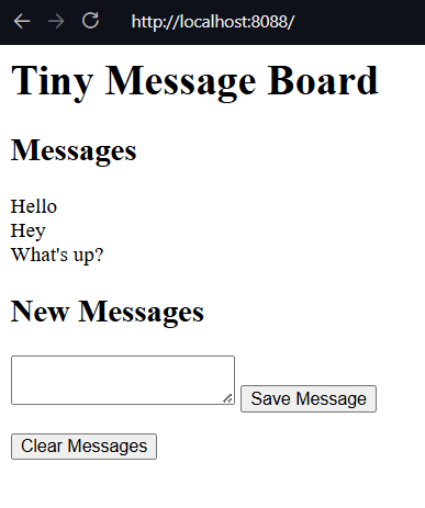 messages = load_messages(datafile)We write load and save methods, define a datafile and then when the server starts up attempt to load from the data file. If it doesn’t exist we create a new message list. Save is also just a standard pickle dump.